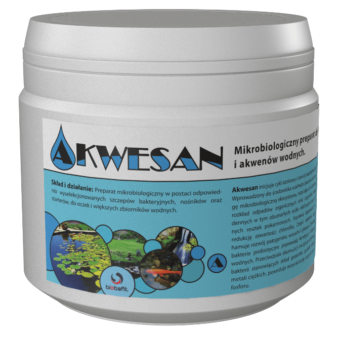AKWESAN to preparat mikrobiologiczny do oczek wodnych, stawów kąpielowych i większych zbiorników wodnych. Zawiera wyselekcjonowane szczepy bakterii psychrofilowych i psychrotrofowych wraz ze starterami, dzięki czemu świetnie sprawdza się już na etapie zakładania zbiornika – inicjuje cykl azotowy i buduje niezbędną florę bakteryjną. Kompozyt bakteryjny pomaga hamować eutrofizację, ogranicza rozwój glonów nitkowatych i sinic, obniża poziom azotu oraz fosforanów, a także poprawia klarowność wody. Dodatkowo bakterie probiotyczne wspierają kondycję i odporność zwierząt wodnych, a w stawach hodowlanych mogą zwiększać efektywność wykorzystania karmy.