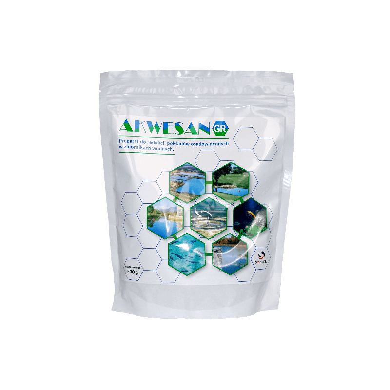 Akwesan GR to granulowany preparat mikrobiologiczny do oczek wodnych, stawów kąpielowych i stawów, przeznaczony przede wszystkim do redukcji mułu i osadów dennych. Zawiera wyselekcjonowane szczepy bakterii naturalnie występujących w środowisku wodnym (m.in. proteolityczne, lipolityczne i celulolityczne), które przyspieszają rozkład materii organicznej na dnie zbiornika. Preparat wspiera także cykl azotowy (nitryfikacja i denitryfikacja), pomaga obniżyć poziom azotu i fosforanów oraz poprawia klarowność wody poprzez redukcję chlorofilu. Granulowana forma zapewnia szybką sedymentację i skuteczne wnikanie w osady, co przyspiesza proces bioremediacji. Bezpieczny dla ludzi, zwierząt i środowiska – może być stosowany przy normalnym użytkowaniu zbiornika.